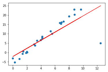 plt.plot(x, w[1] * x + w[0], linestyle='solid', color='red')