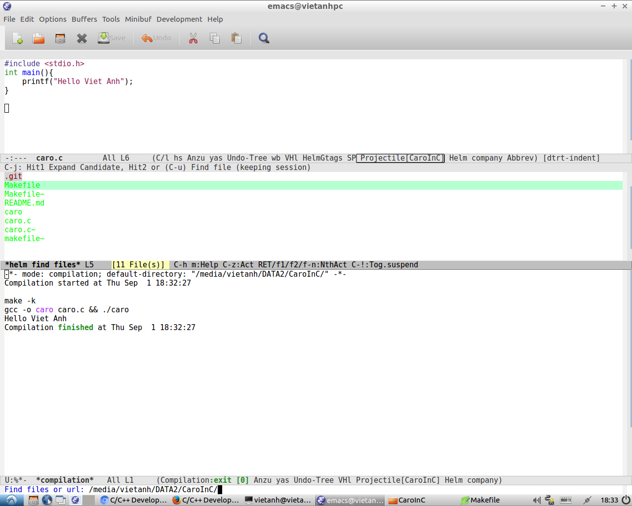Nếu ae muốn ấn F5 vừa biên dịch xong chạy luôn chương trình trong cửa sổ emacs như hình dưới thì sử dụng Makefile như sau (thay tên hello > tên file nguồn của bạn):