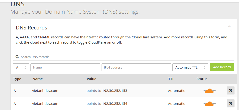 Bạn muốn sử dụng một tên miền đã đăng kí được cho website của mình, ví dụ: vietanhdev.com, blog.vietanhdev.com, tenban.net, trước hết chúng ta cần thay đổi bản ghi DNS của tên miền để trỏ tới hosting của Github Pages. Bạn hãy thêm bản ghi A (A record) tại phần thiết lập DNS của tên miền trỏ tới 192.30.252.153 và 192.30.252.154. Ở đây tôi sử dụng dịch vụ DNS của Cloudflare.