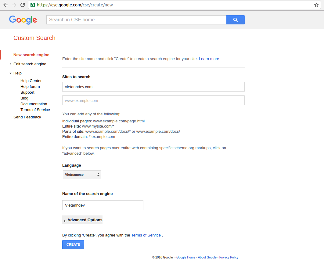 Truy cập https://cse.google.com/cse/ và nhấp Create a custom search engine nhé. Bạn sẽ được chuyển tới trang tạo mới công cụ tìm kiếm: https://cse.google.com/cse/create/new. Tại đây, hãy nhập đầy đủ các thông tin cho công cụ tìm kiếm của bạn.