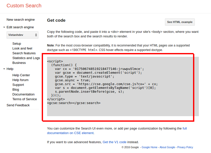 Sau khi tạo xong Google Custom Search, nhấp Get the code để lấy mã.