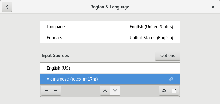 Fedora có sẵn bộ gõ Tiếng Việt. Ta có thể bật nó bằng cái vào Settings > Region & Language > Nhấp dấu + để thêm bộ gõ > Tìm đến Vietnamese > Chọn kiểu bộ gõ tiếng Việt bạn sử dụng. Tôi dùng kiểu gõ telex (gõ s,f,j,x,r cho các dấu câu) nên tôi chọn Vietnamese (telex (m17n)). Bạn có thể chuyển qua lại giữa các bộ gõ qua menu hệ thống góc trên bên phải nhé.
